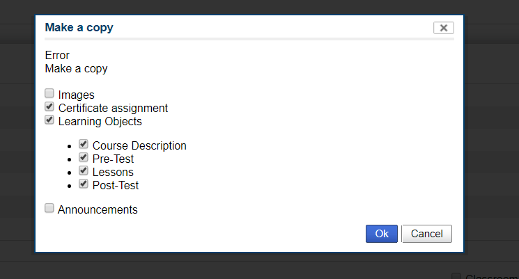 I seem to be able to edit courses and remove courses but when I try to copy a course it just offers the word "Error"