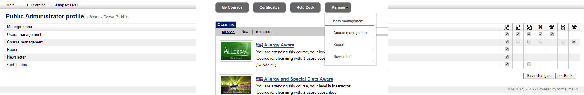Backend functionalities: user management, course management, reports, certificates, etc.