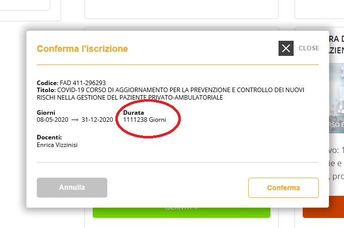 Ciao, credo trattasi di bug, relativamente alla durata in giorni che appare quando ci si iscrive ad un corso dal catalogo. I giorni effettivi sono le ultime tre cifre, ma non è chiaro il significato della serie di 1 che precedono. Allego l'immagine.
