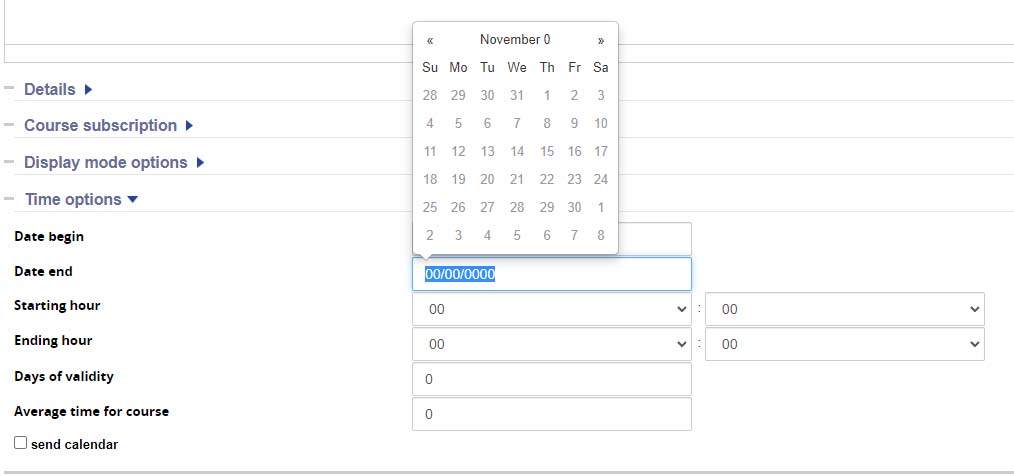 Where does the date picker in the Course Time (not editions), draw the current date from, when I open it, it's showing by default November 0?