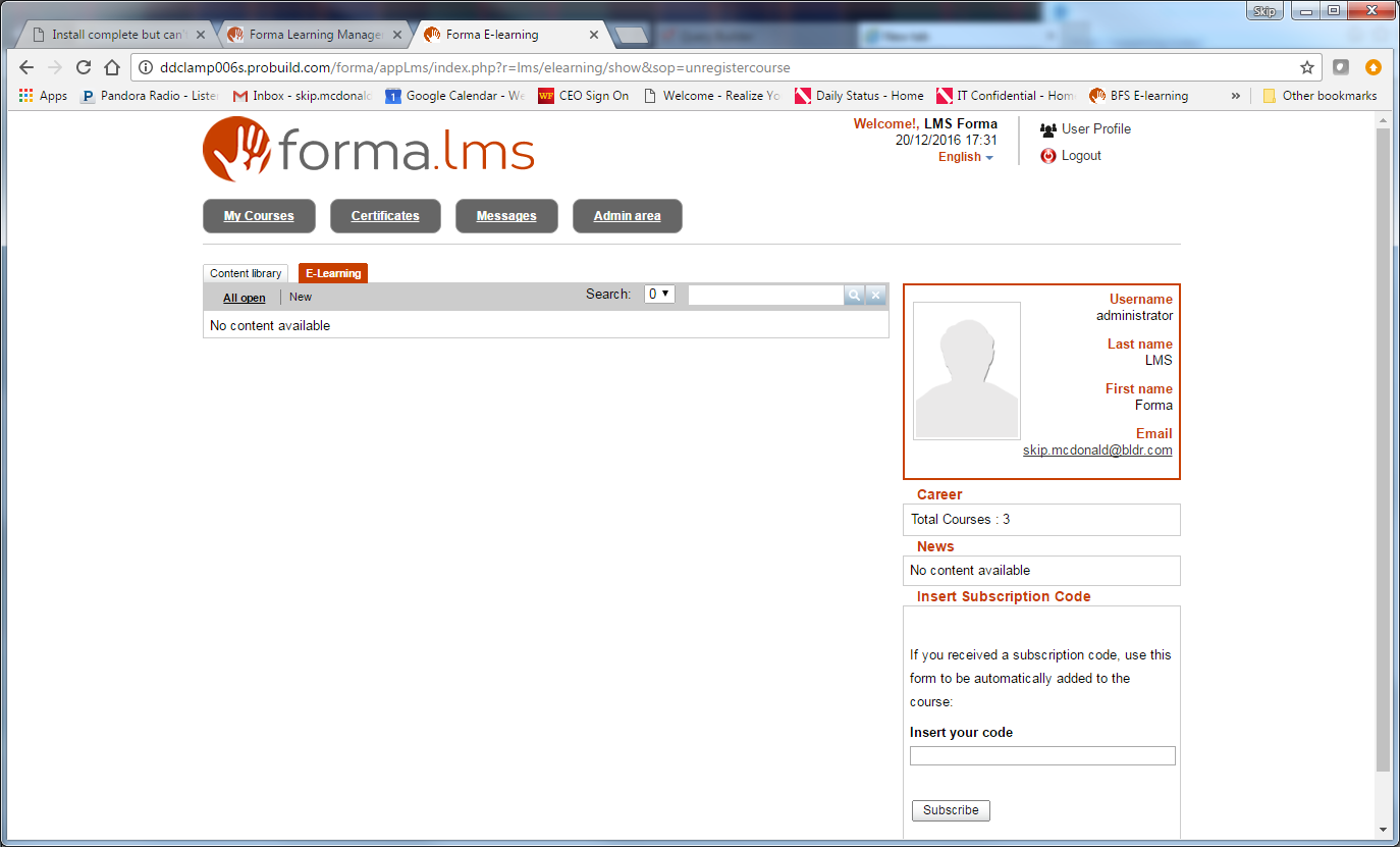 administrator is indeed enrolled to both courses. I fear there is something fundamental wrong with the installation. are others using Red Hat Linux?
