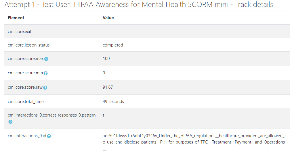 I have also created a testuser which will take that specific course. After completing that course successfully using testuser. I see following result. I need scorm interatcion data which is empty right now. But I need it filled.