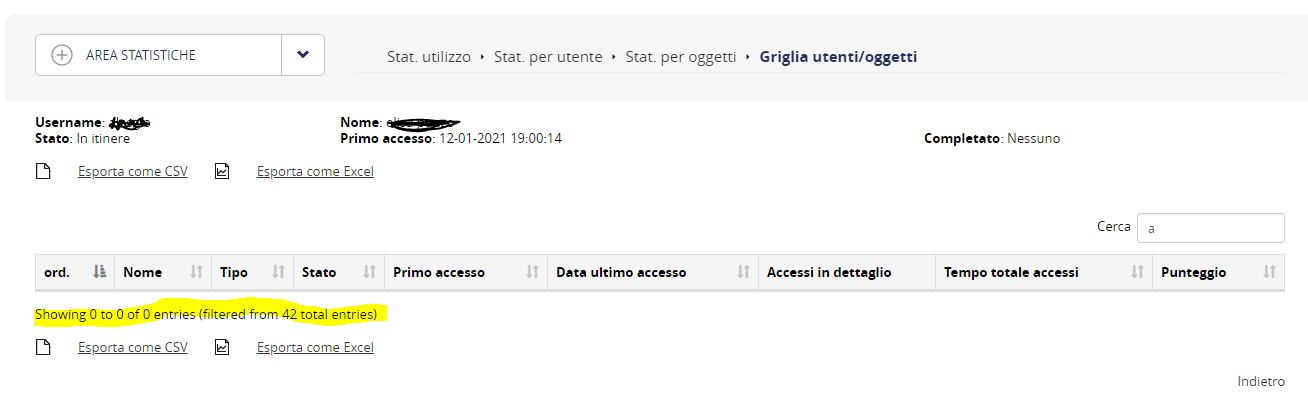 Nella schermata in cui viene mostrata la tabella utente/corso invece non mi vengono mostrate le statistiche per singolo oggetto (legate al singolo utente), e da debug non viene indicato alcun Fatal Error.