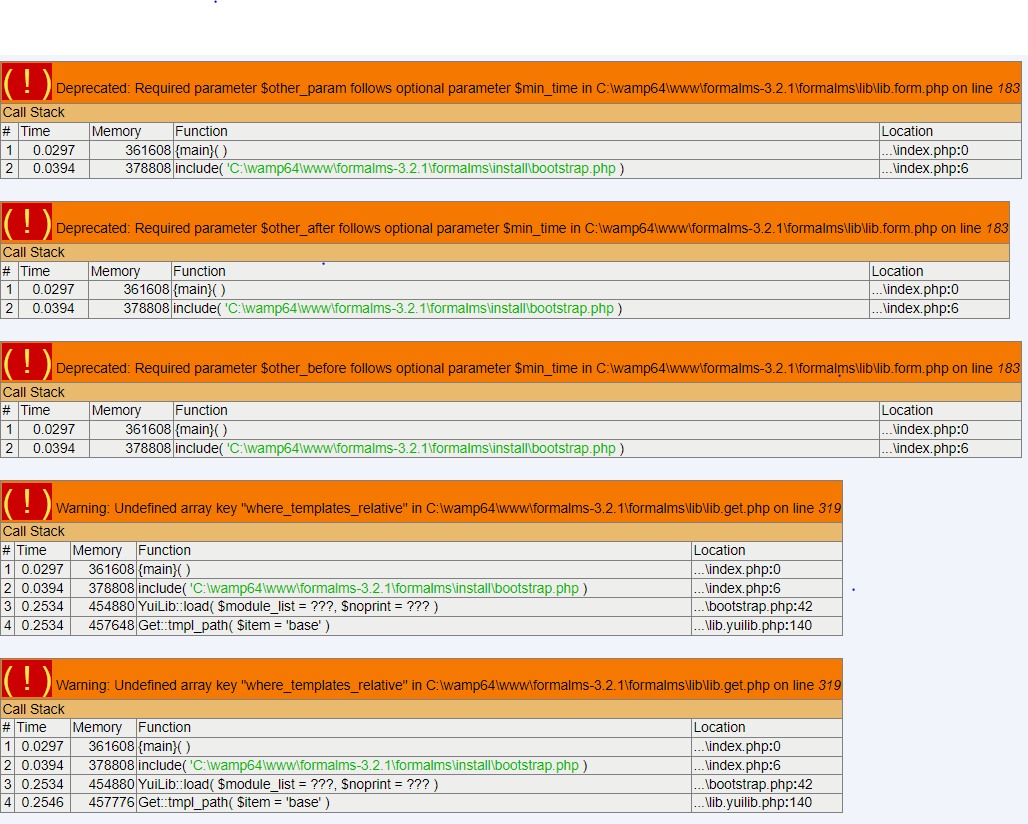 I need help please. I have a problem when I install formalms 3.2.1. I am on windows 10 and I have installed wamp 3.3.0 x64. If I try to install I get the error messages that I put in the attachment. And I don't understand even though I followed the instructions well.